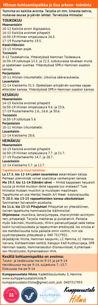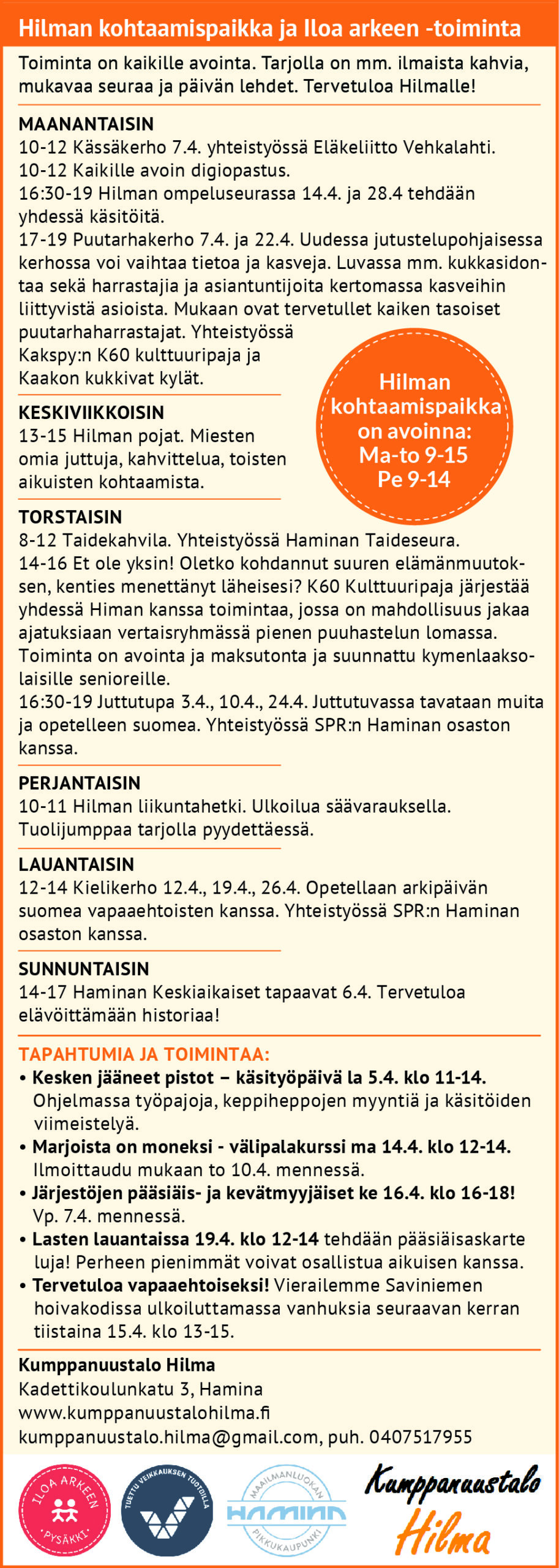- 13-15 Hilman pojat. Miesten omia juttuja, kahvittelua, toisten aikuisten kohtaamista.